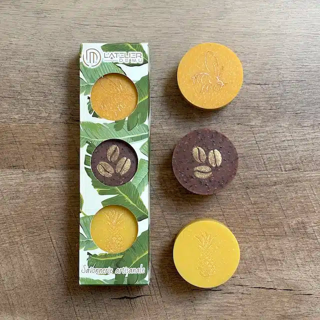Coffret comprenant 3 savons de 40 g chacun : Miel péi, Café exfoliant et Ananas. Surgras à 8%. Cet ensemble est parfait pour découvrir ou faire découvrir la gamme.