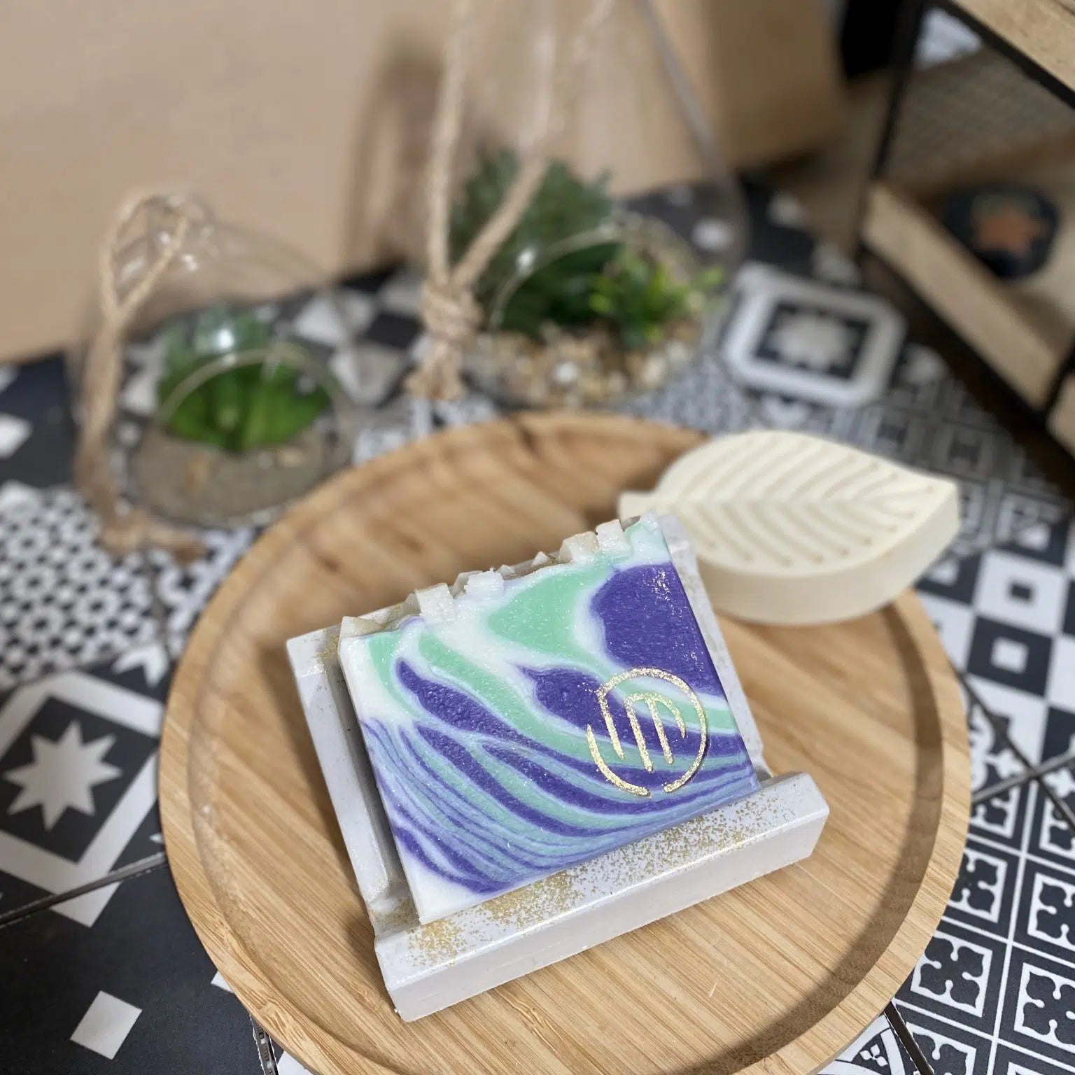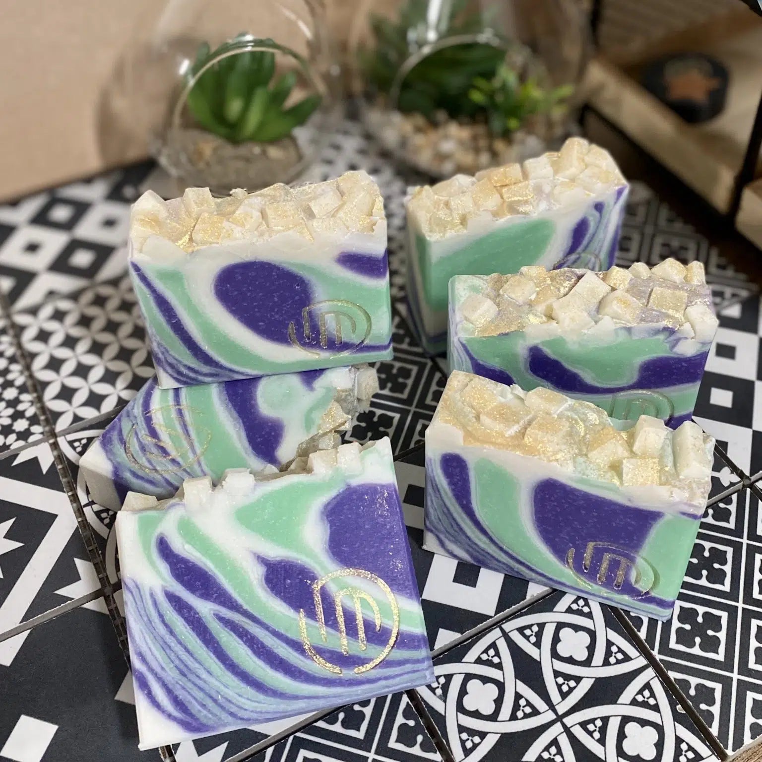 huile d’olive, huile de coco, beurre de karité, glycérine, fragrance, lactate de sodium, micas vert et violet